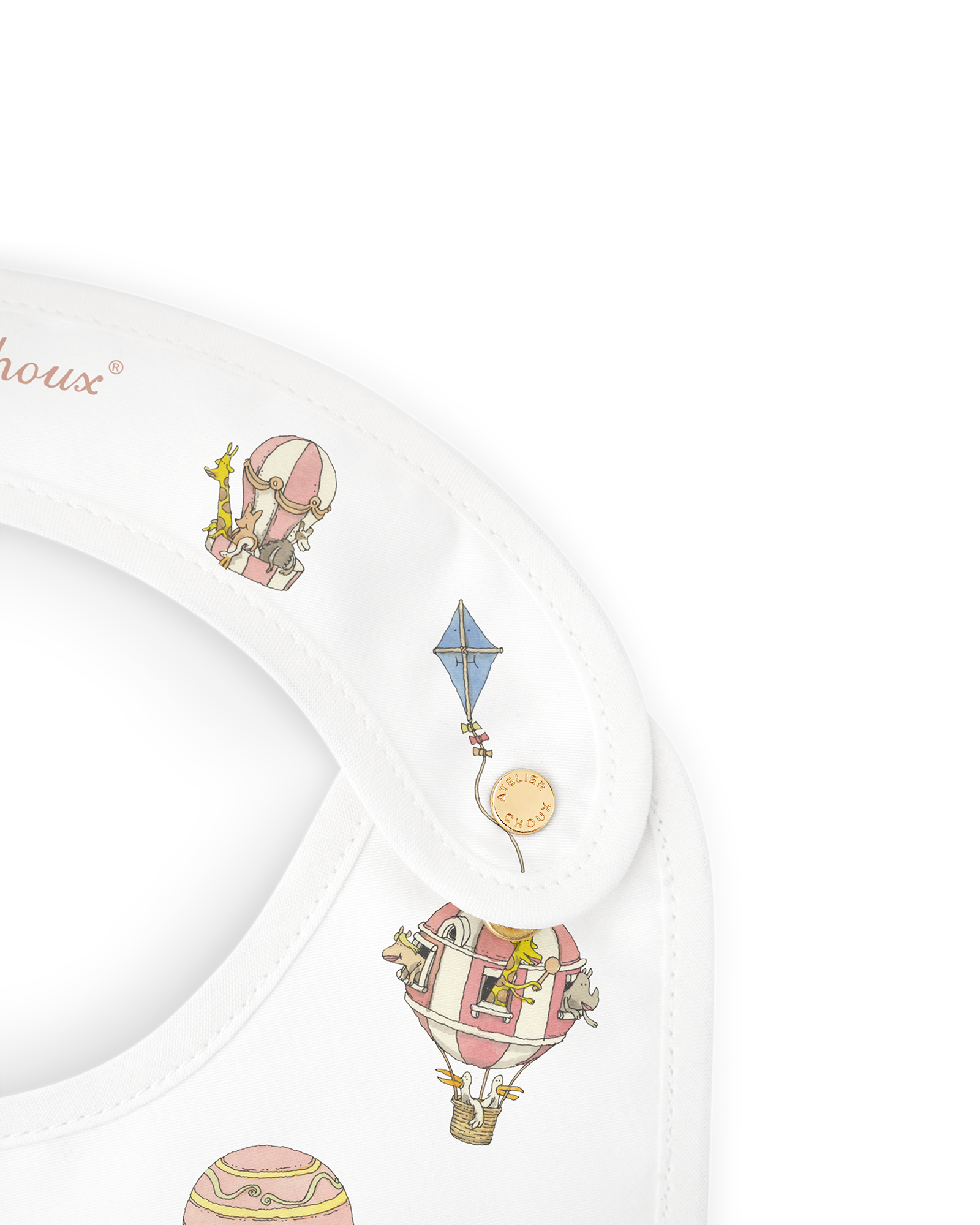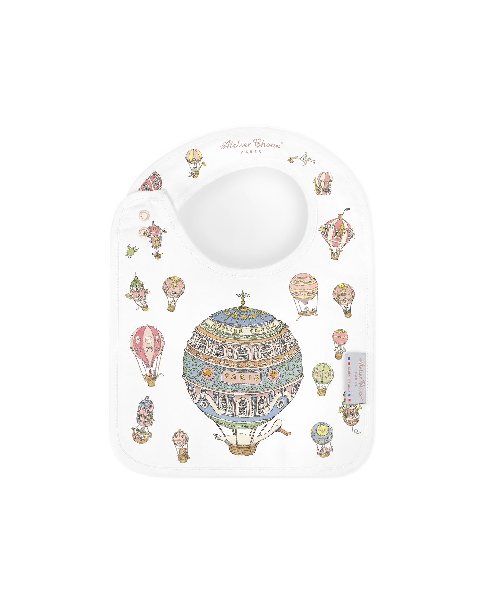 Reversible and adorned with original illustrations on both sides, the Atelier Choux bib blends practicality with artistic charm. The bib is adjustable and features branded golden snaps. Recommended from birth to 24 months.
