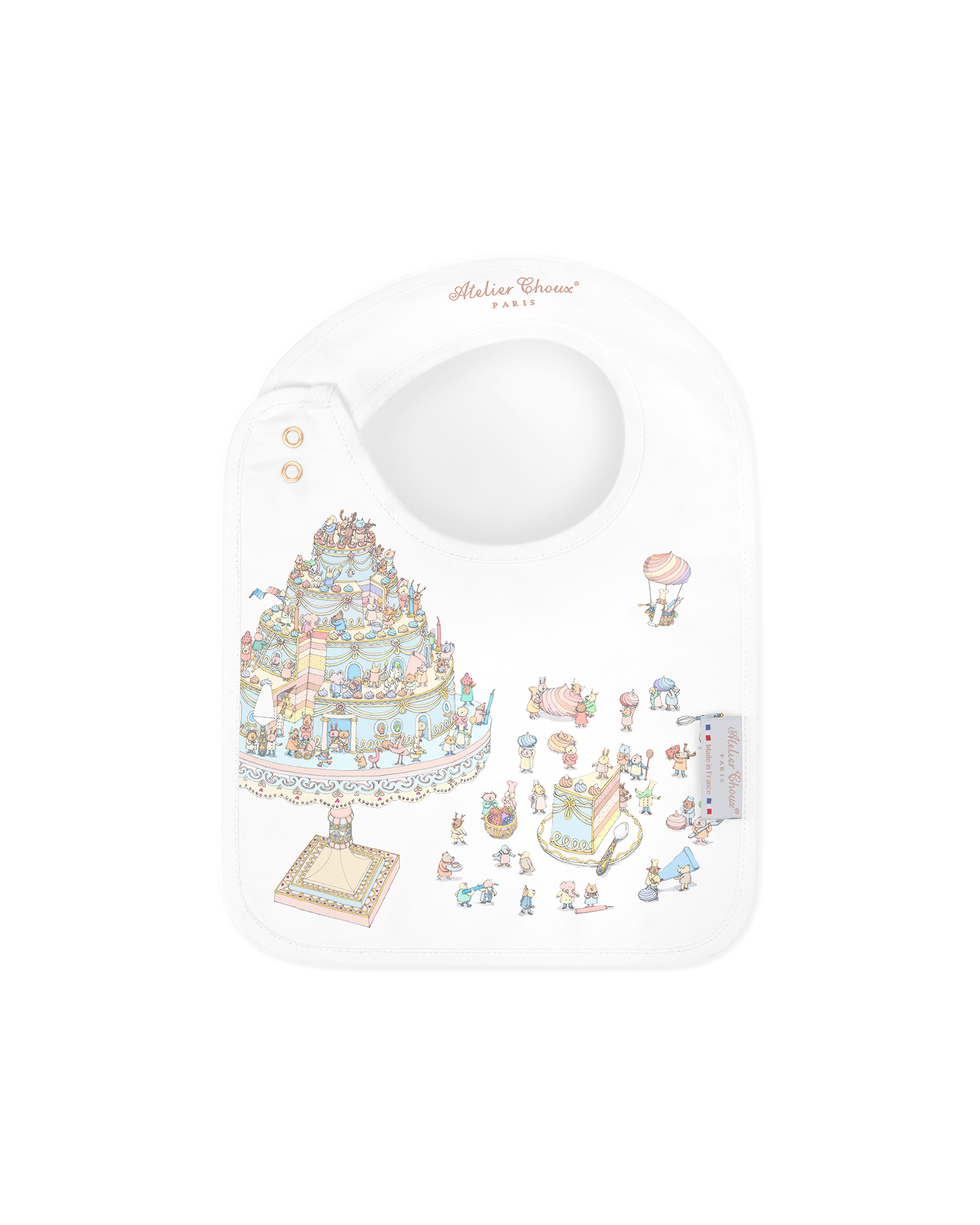Reversible and adorned with original illustrations on both sides, the Atelier Choux bib blends practicality with artistic charm. The bib is adjustable and features branded golden snaps. Recommended from birth to 24 months.