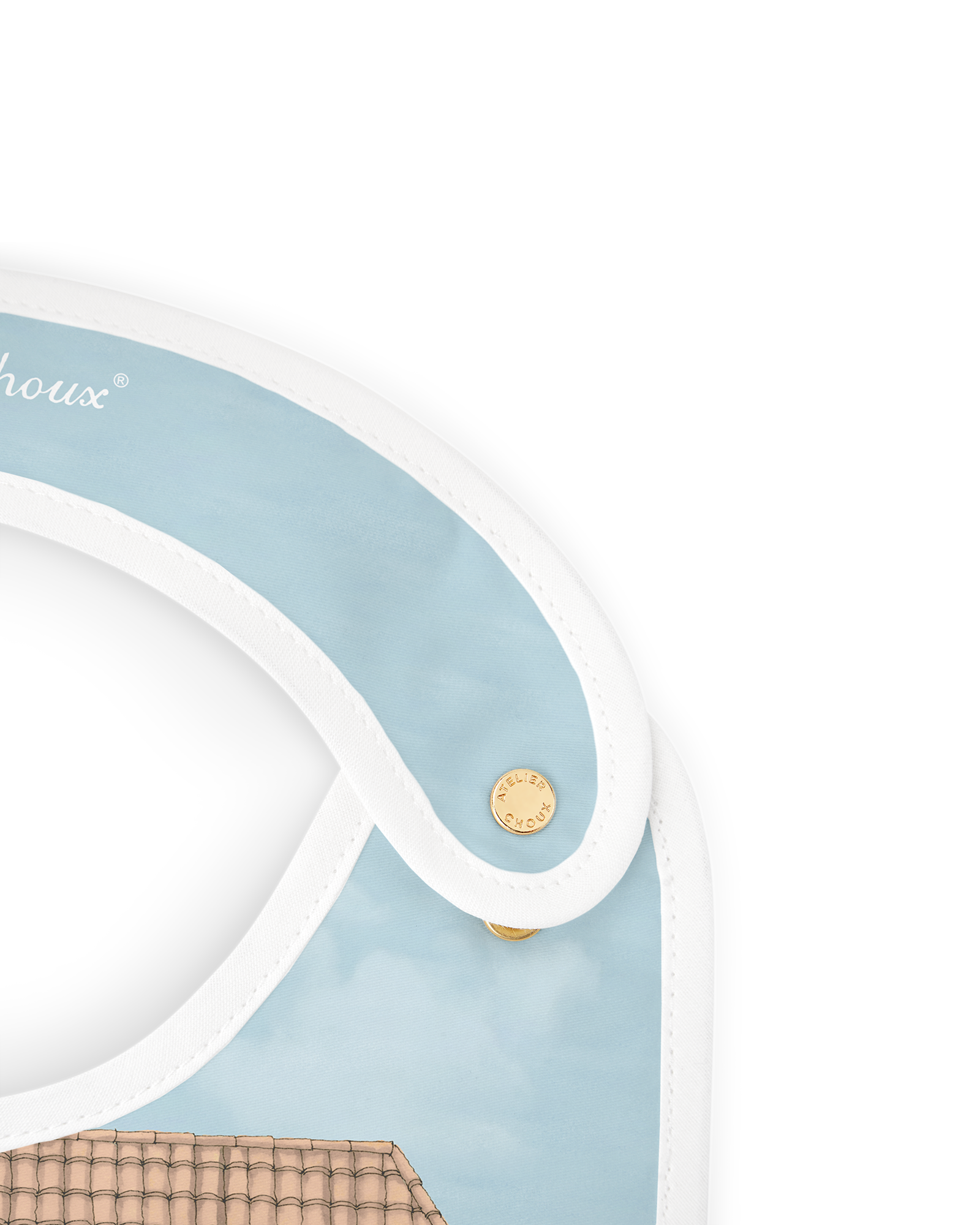 Reversible and adorned with original illustrations on both sides, the Atelier Choux bib blends practicality with artistic charm. The bib is adjustable and features branded golden snaps. Recommended from birth to 24 months.