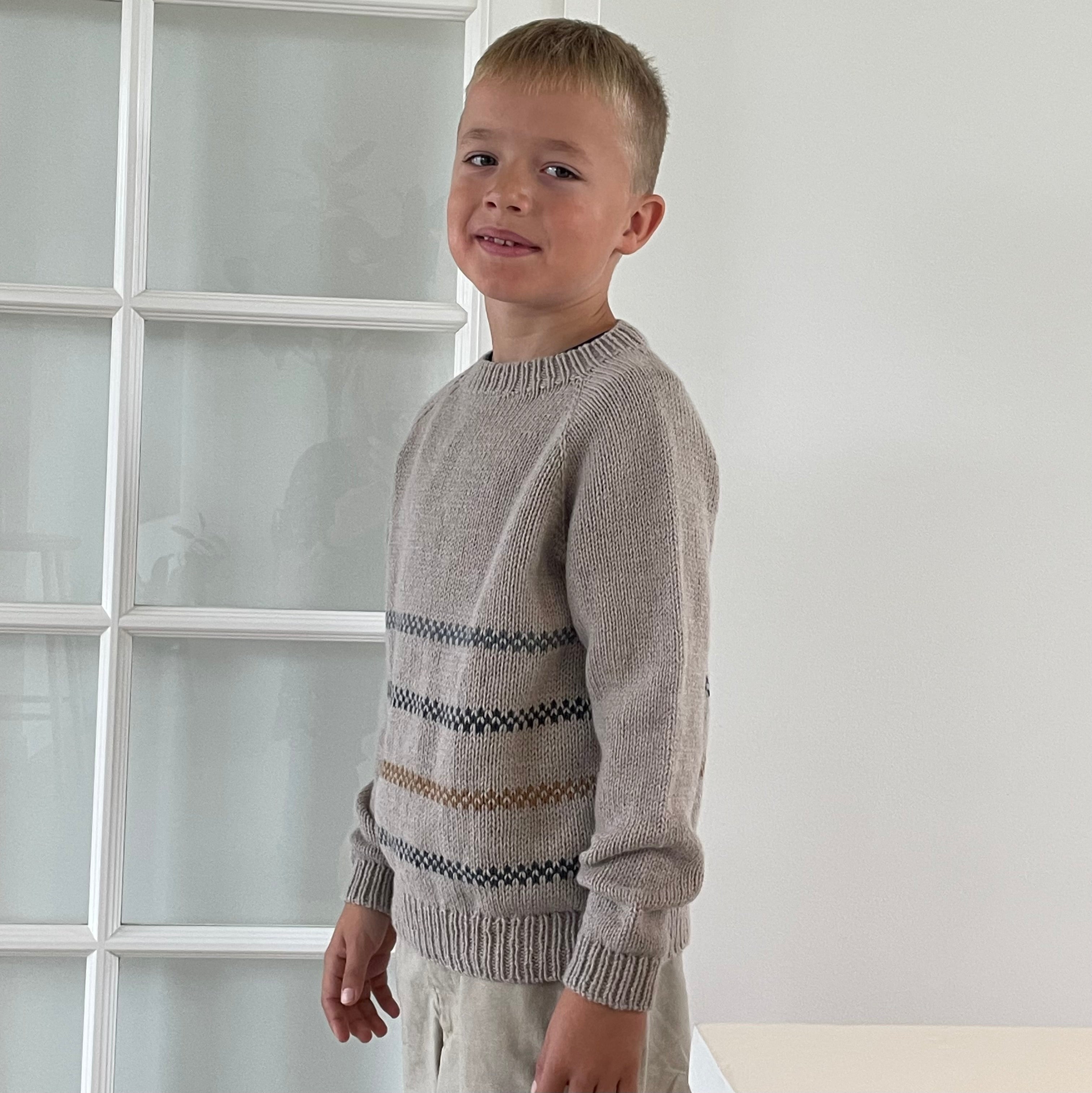 Gorm Sweater Junior is a classic, timeless sweater. It is worked with 2 threads top down with long sleeves. At the body, a pattern with 3 contrasting colours is worked, using the fair isle technique. Ribbings at the body and the sleeves are worked, before they are bound off with the tubular method. The neckline is shaped with short rows (here: German short rows).