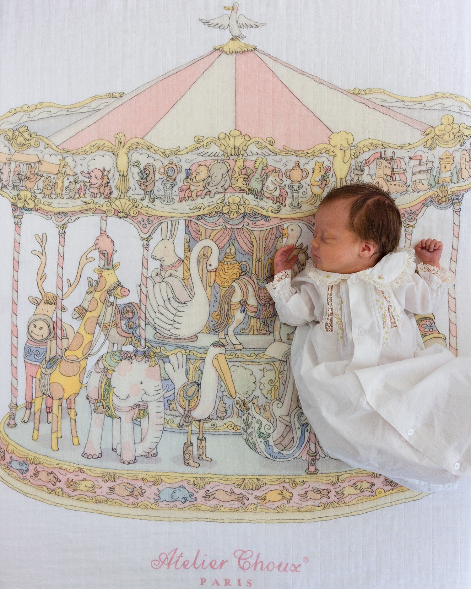 Atelier Choux Carr茅 �� Carousel Pink is a multifunctional piece for elegant daily use �� perfect as a swaddle, lightweight blanket, stroller accent, or decorative photo background.