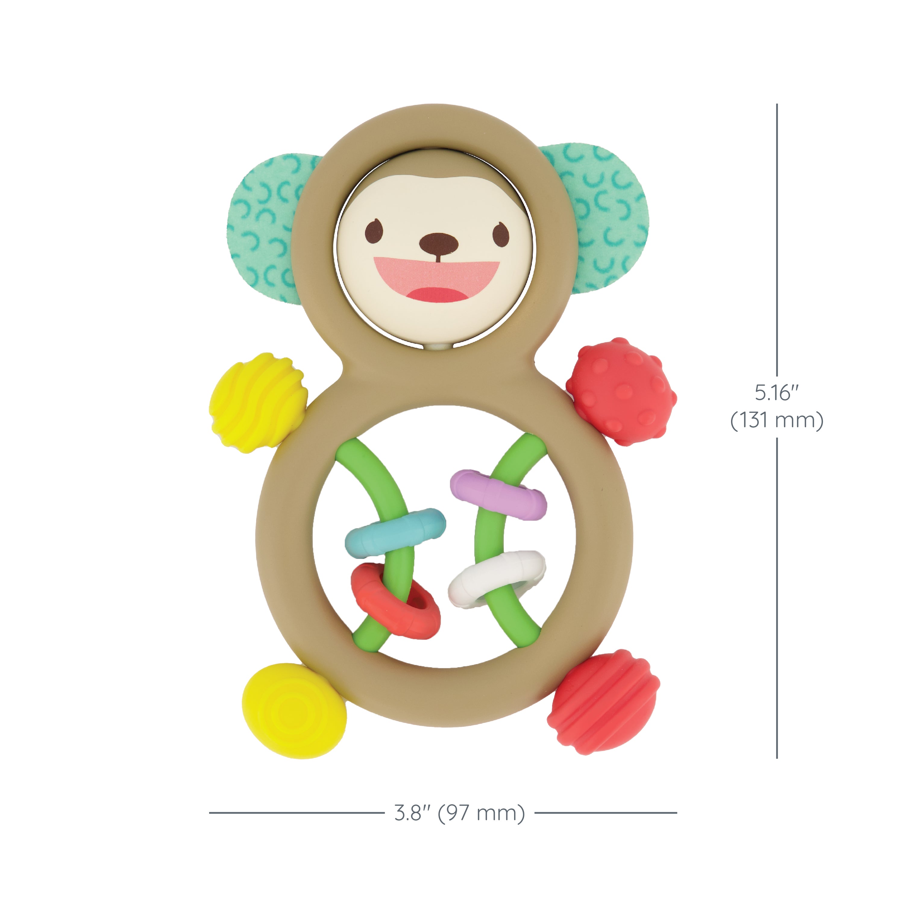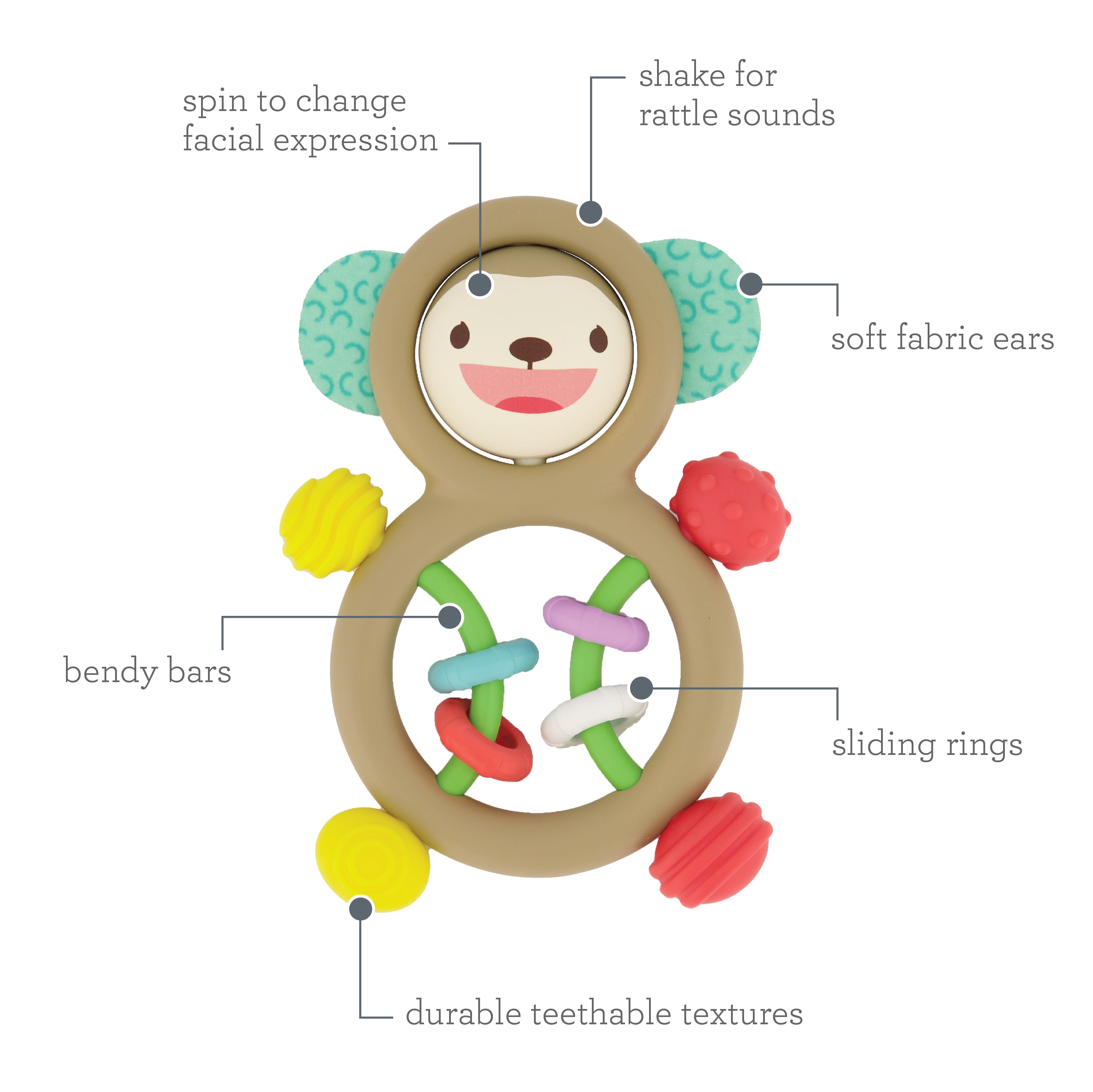 The Infantino Busy Lil' Sensory Rattle engages the senses. This adorable character is packed with 360 degrees of exploration and playtime fun! Your baby can explore mixed materials, from soft fabric ears to durable teethable textures, and spin the monkey's head to see its facial expression change. You'll love hearing your baby shake it for exciting rattle sounds! The two bendy bars with interactive sliding rings help develop fine motor, cause and effect, and sound recognition skills. They'll love that this perfectly sized toy is easy to hold and take on-the-go adventures with them! Give your little one the gift of endless entertainment and sensory exploration with the Infantino Busy Lil' Sensory Rattle today.
