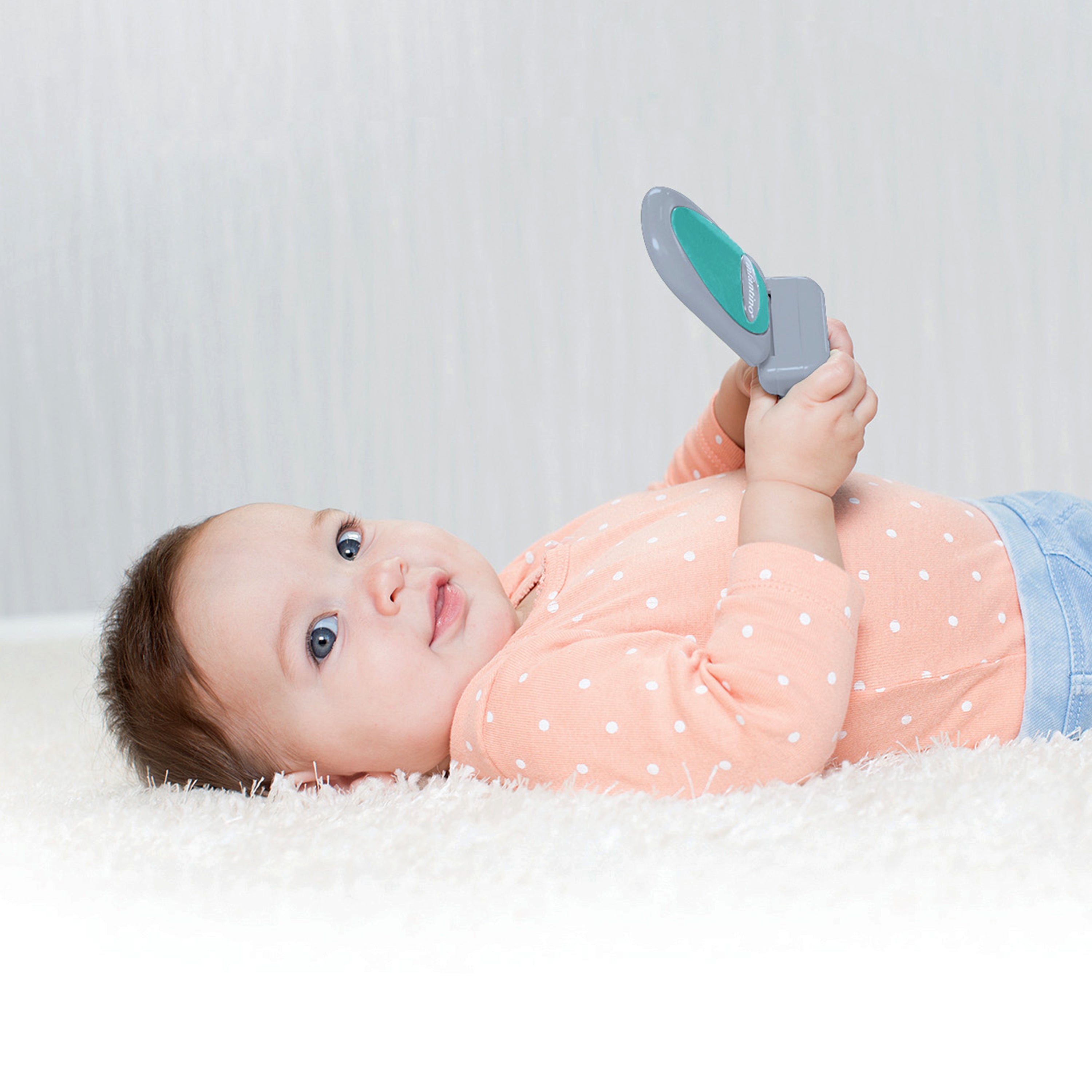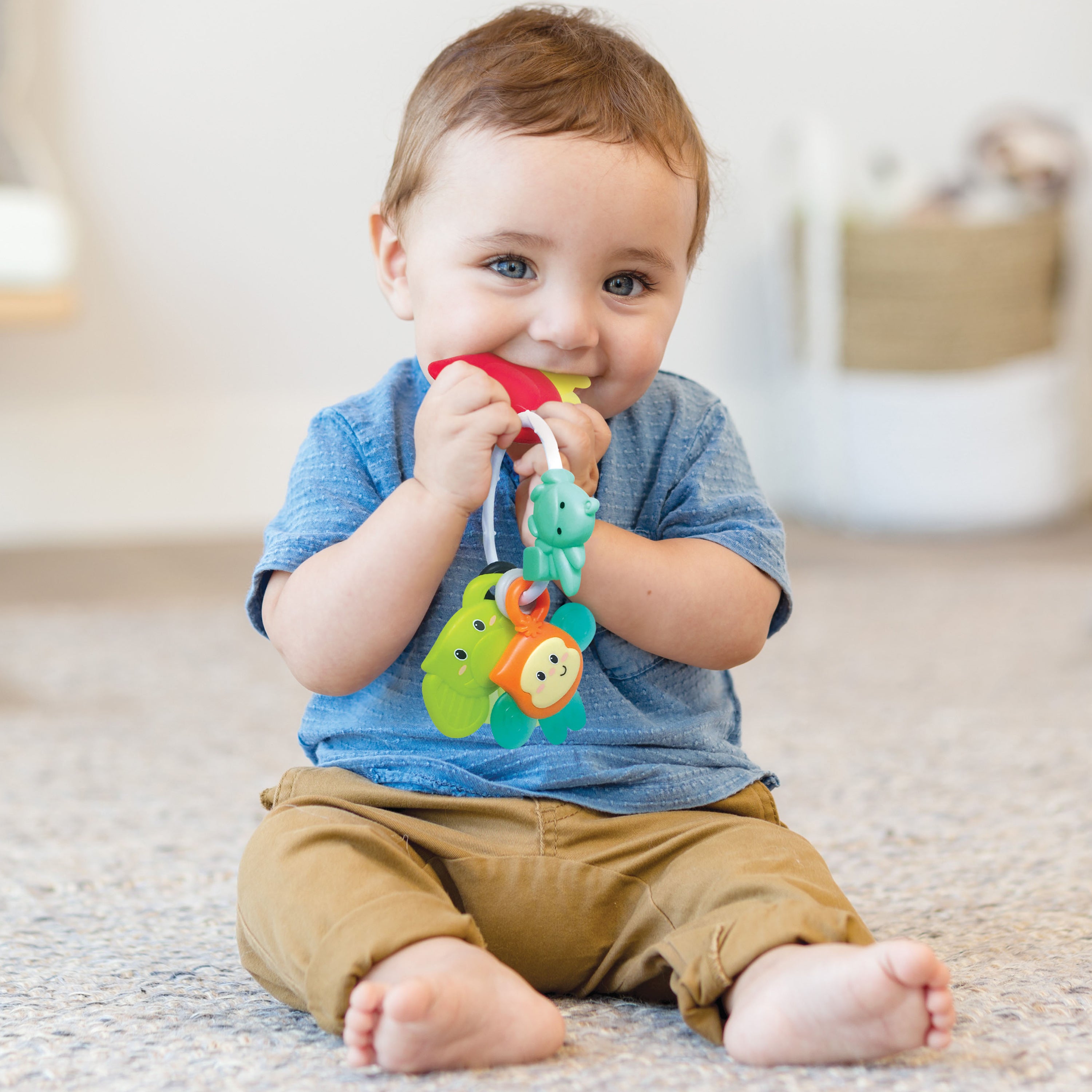 The 3-piece Mini Me Pretend Play Set offers babies a fun connection between their toys and role-playing. Little travelers can pretend to mimic the adults in their lives while building developmental skills. The easy-to-hold flip phone encourages speaking skills in English and Spanish. A colorful key ring keeps busy little hands entertained with a trio of safari teething pals. The teethable passport is a great way to introduce little ones to the big world. Babies will learn sensory and fine motor skills through a variety of auditory and visual stimuli.