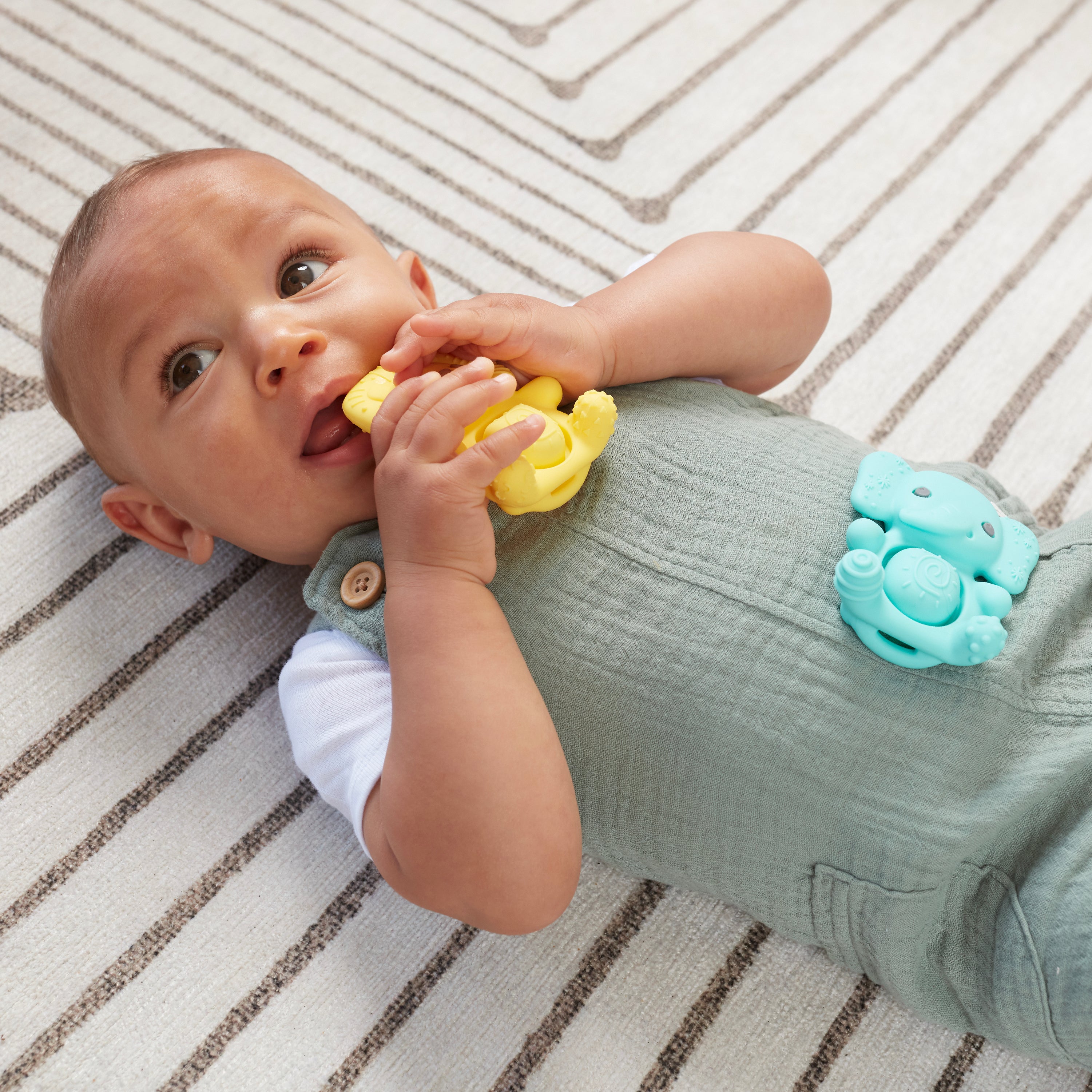 Introducing the Infantino Teethimal Pop Pals! This set of two soft silicone pals is designed to provide babies with various textures for soothing tender gums. With these fun yet practical pals, your baby can develop their early fine motor skills by using hand-eye coordination to push on the irresistible sensory engaging popping bellies. The Teethimal Pop Pals are the perfect size for curious little hands to hold and explore while providing a comfortable mouthing experience for sore erupting teeth. A loop on the back of each pal makes it easy to attach them to a pacifier clip or any other convenient spot so they are always near and never lost. After each use, wipe down the pals for quick cleaning. The Infantino Pop Pals will give your little one tons of fun and soothing comfort.