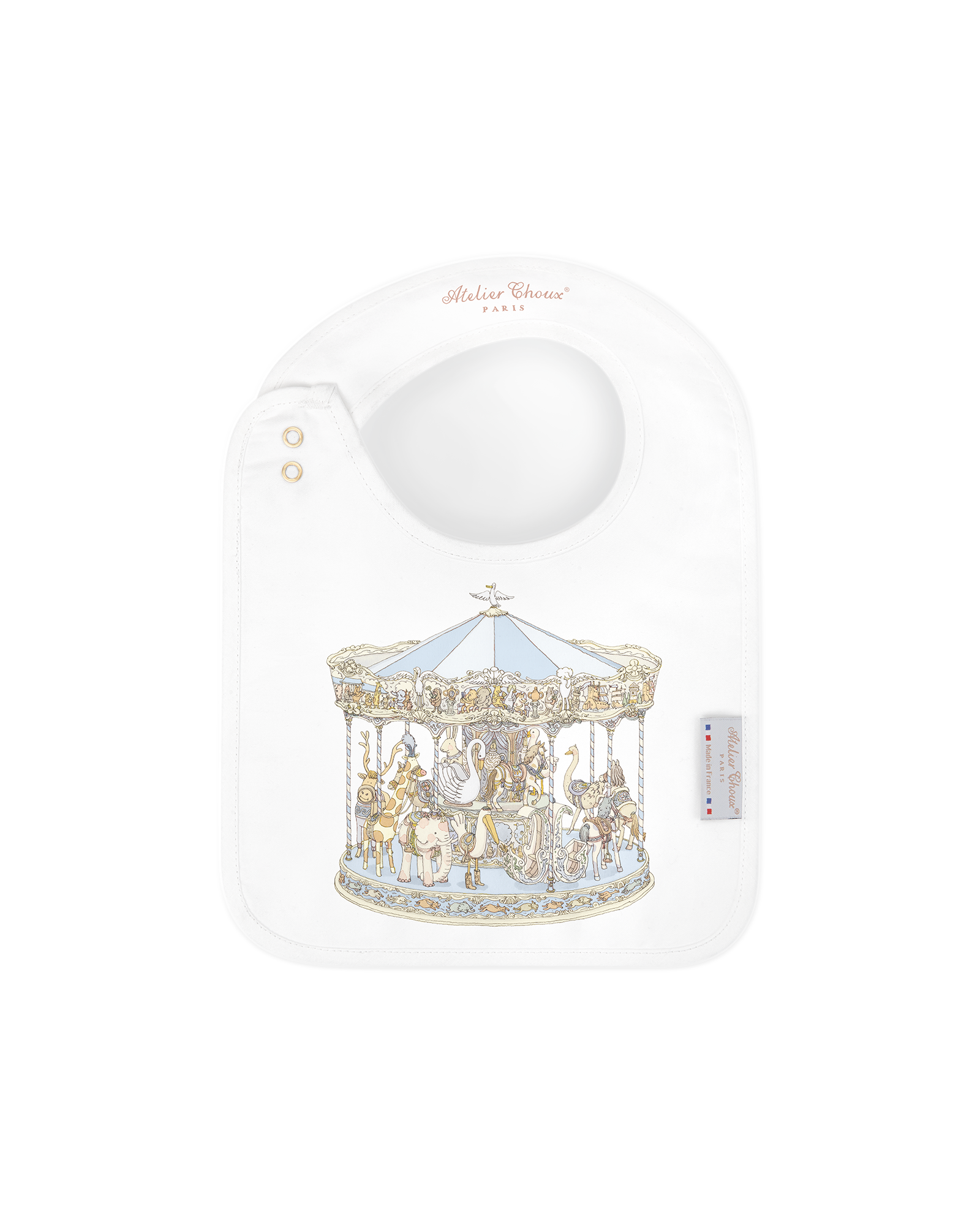 Reversible and adorned with original illustrations on both sides, the Atelier Choux bib blends practicality with artistic charm. The bib is adjustable and features branded golden snaps. Recommended from birth to 24 months.