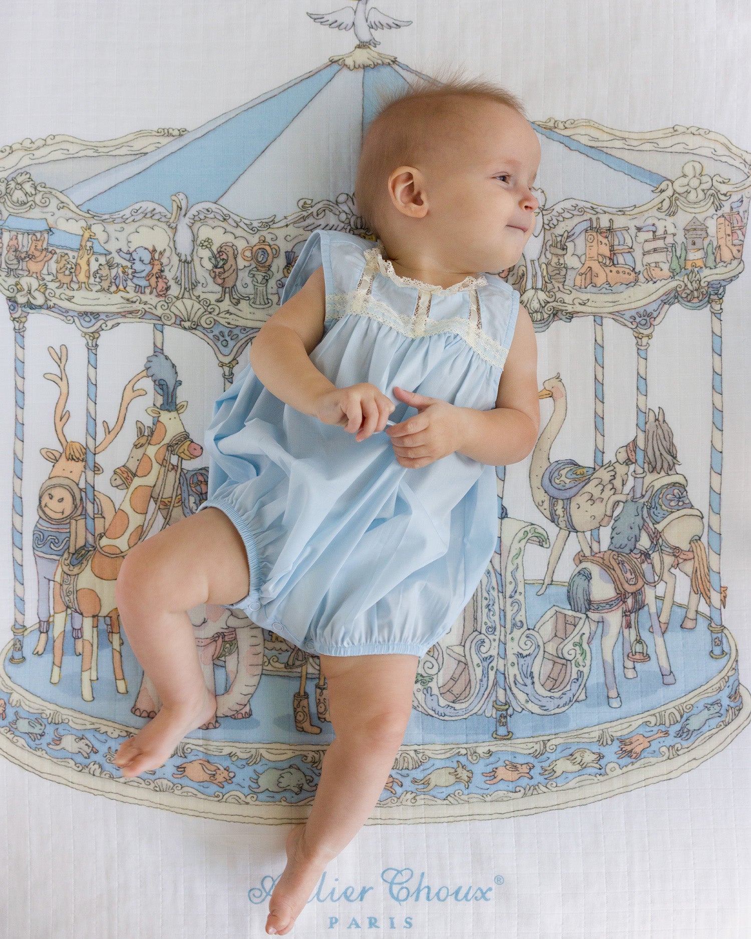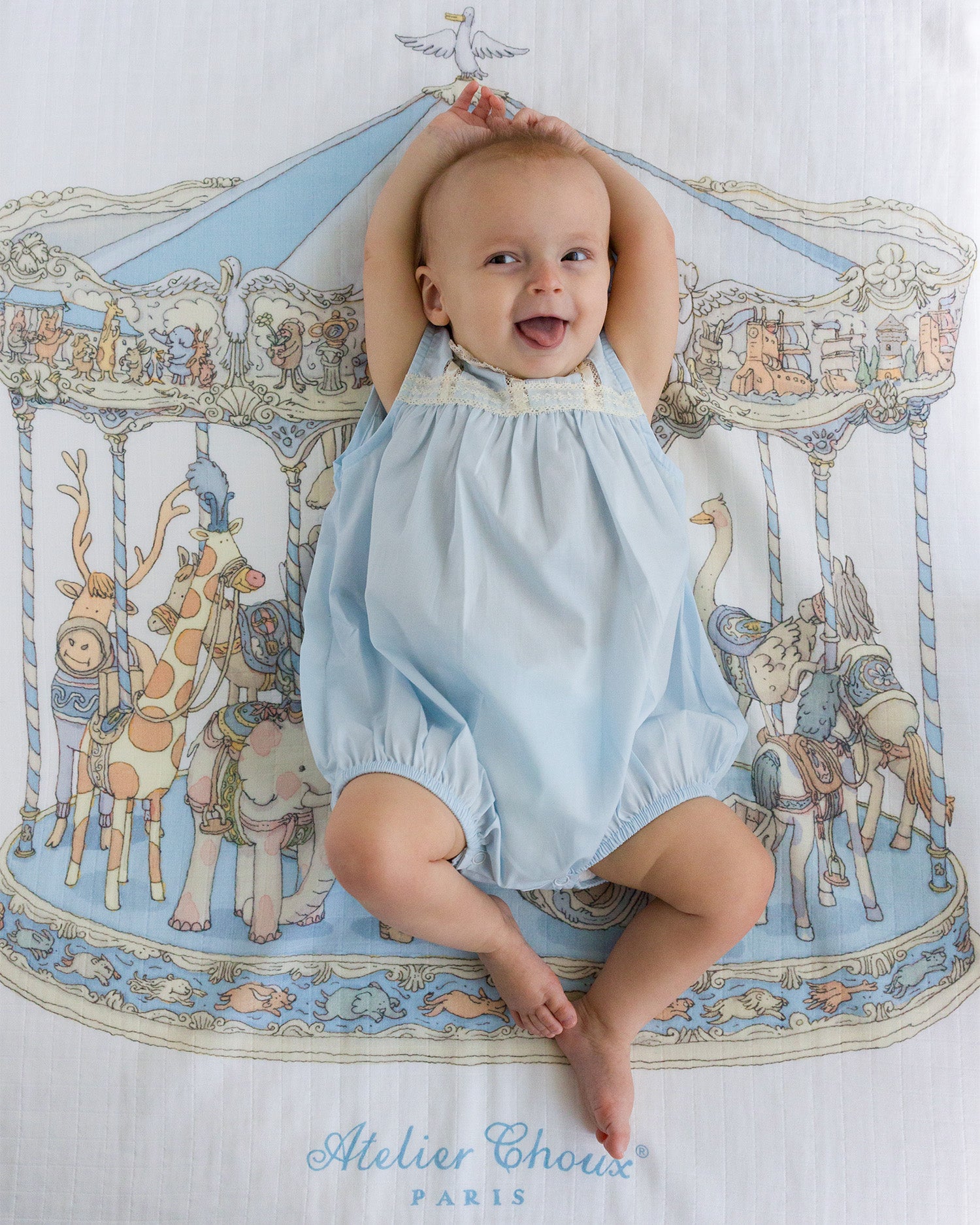 Atelier Choux Carr茅 �� Carousel Blue is a multifunctional piece for elegant daily use �� perfect as a swaddle, lightweight blanket, stroller accent, or decorative photo background.�