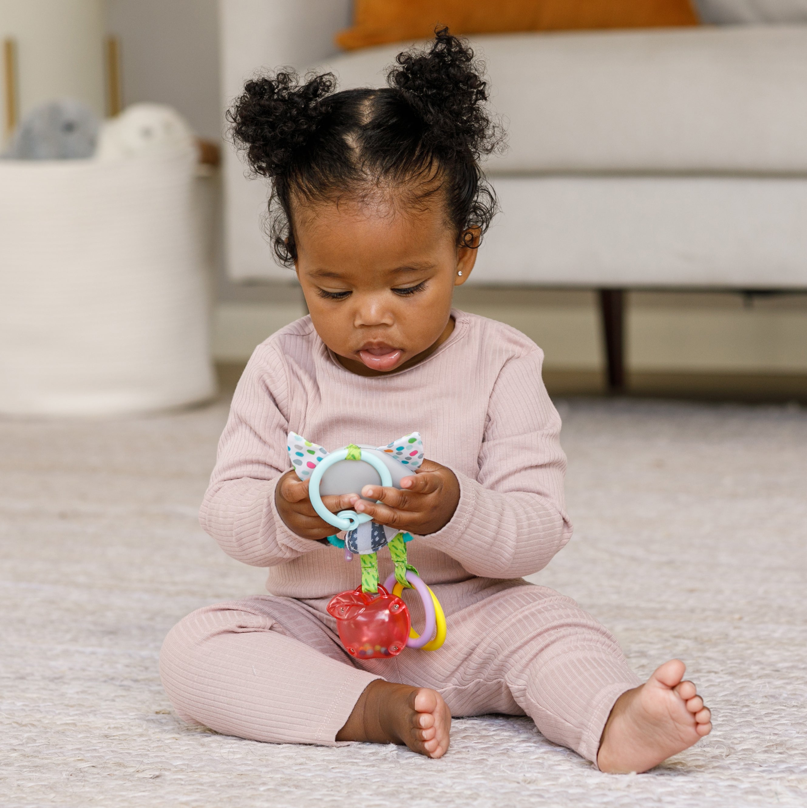 The Infantino Jingle Charms Rattle is the perfect toy for on-the-go entertainment! This adorable raccoon rattle features bright contrasting colors and a variety of tactile elements that will stimulate your baby's fine and gross motor skill development. The crinkle ears and fabric tail provide plenty of texture for busy little hands to explore, while the slip-sliding beads and click-clacking rings provide sensory feedback. It's sure to promote early cause-and-effect awareness as well! With an easy-to-attach link ring, bringing this delightful toy wherever you go is simple—from strollers and diaper bags to baby carriers and play gyms; this toy loves to travel! Recommended for infants aged 0 months and up, the Infantino Jingle Charms Rattle will quickly become your little one's favorite friend!